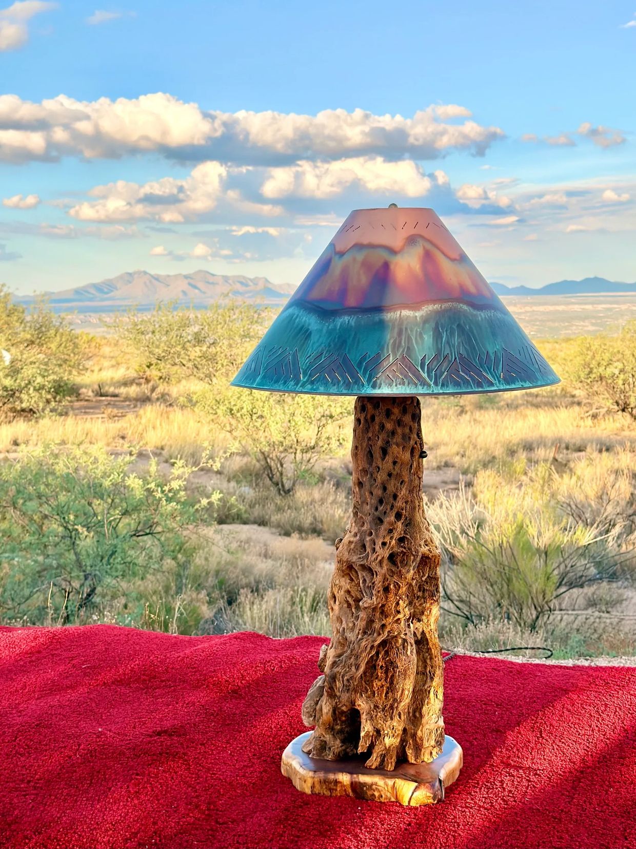 At Almost Home, we believe in creating lighting that tells a story. Our passion for craftsmanship shines through in every lamp and shade we offer, reflecting both quality and artistry. Each lamp is one-of-a-kind featuring a river of Turquoise on the base and Copper handcrafted shades as unique as an Arizona sunset. We have both floor and table lamps ready to ship!